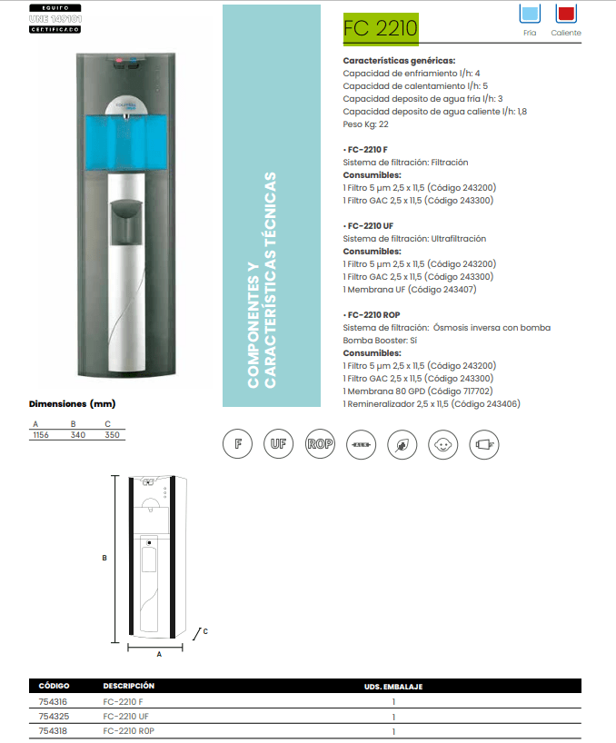 La Fuente Columbia FC-2210 combina diseño moderno, comodidad y rendimiento en un solo equipo, ideal para oficinas, comercios o espacios domésticos. Proporciona agua fría y caliente de forma continua, con opciones de tratamiento adaptadas a cada necesidad: filtración, ultrafiltración o ósmosis inversa con bomba booster.