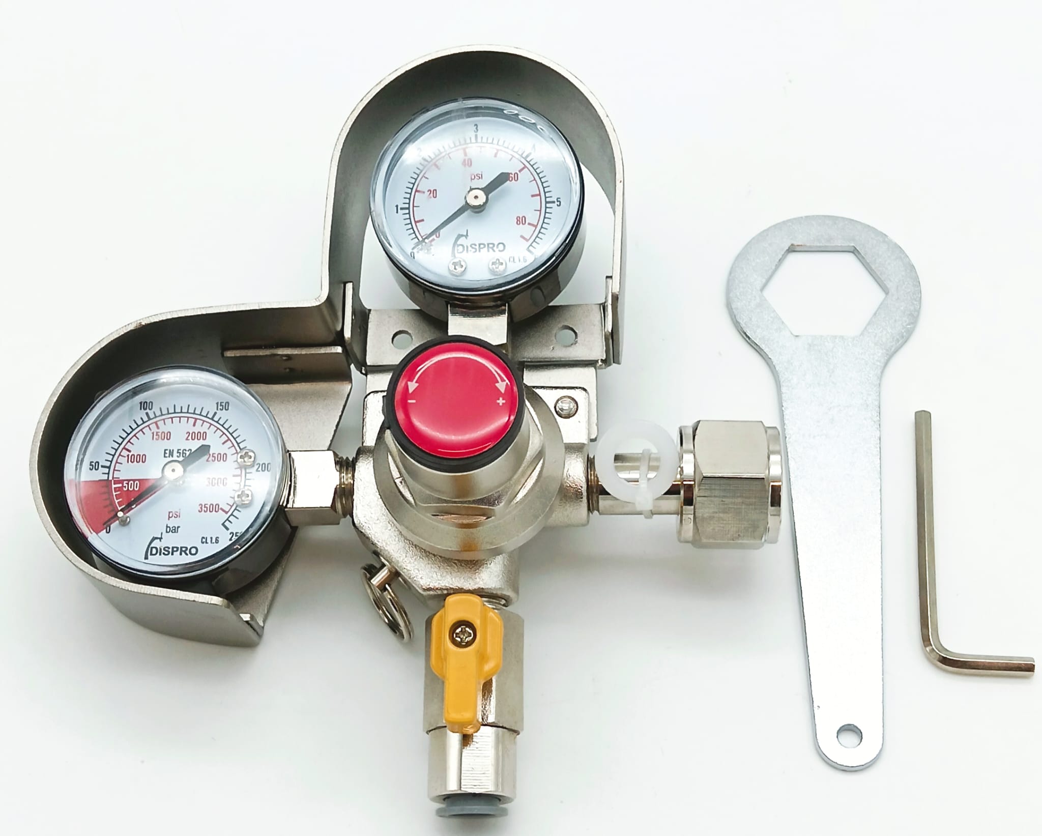 Regulador Plus de CO2  (con aros protectores) con una salida con llave de corte y JG de 3/8″ (conector rápido).
