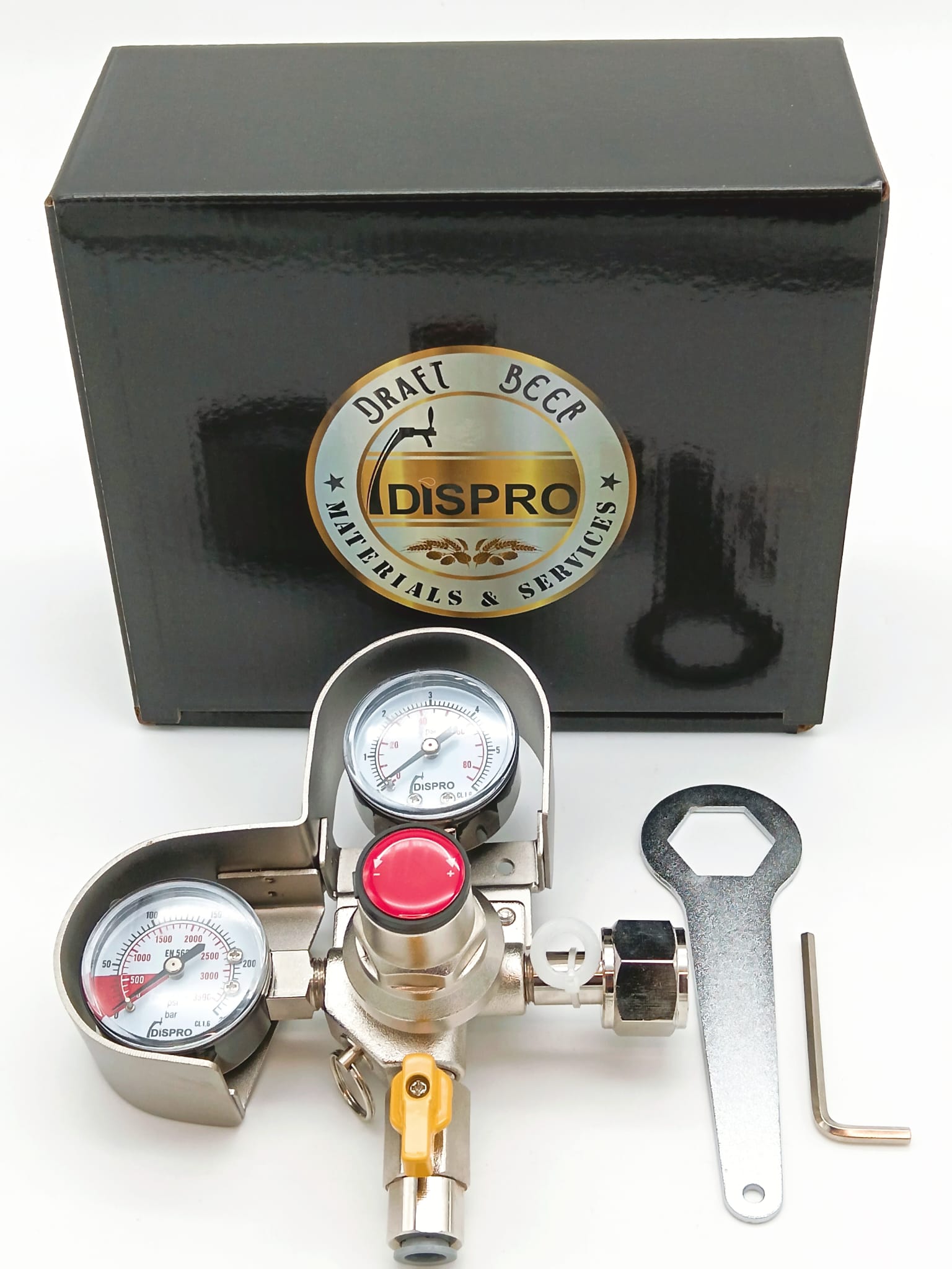 El regulador de gas contiene un tornillo de ajuste manual con llave tipo Allen (incluida) o mando para regular la cantidad de presión suministrada al barril.